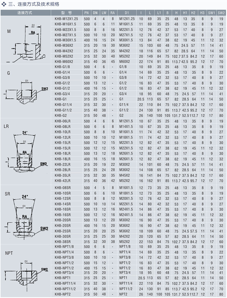 2、連接材料:G形式、LR形式、SR形式、M形式、NPT形式